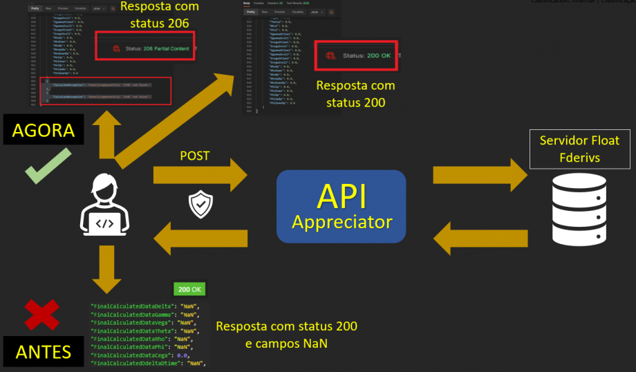Quando o usuário inseria um ativo que não existia na API Appreciator, o servidor retornava a resposta com o status 200 (resposta de status de sucesso que indica que a requisição foi bem sucedida), porém com vários campos preenchidos com “NaN”. Sabendo-se disso, melhorias foram efetuadas nessa ferramenta, sendo que agora foi incluído o status 206, o qual indica que a resposta está parcialmente correta, sendo os erros exibidos com mensagens simples e objetivas. Por exemplo: se inserir o ativo IVVB nos campos da API e o servidor não localiza-o, a resposta é exibida através da Exception “UnderlyingAssetId(s) 'IVVB'not found com status 206. Por outro lado, se tudo estiver correto, a resposta será o status 200 sem nenhuma Exception.