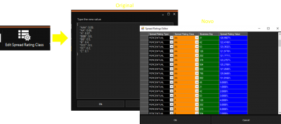A nova tela foi nomeada como Spread Ratings Editor. O objetivo é facilitar o usuário a modificar o Spread Rating, pois basta apenas clicar os campos em que se deseja alterar e posteriormente clicar sobre o botão OK. Além disso, outro ponto foi deixar a tela mais visual ao usuário.