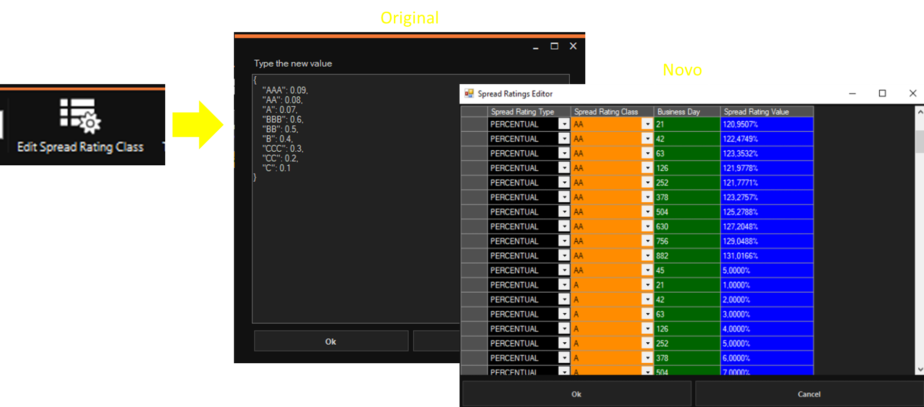 A nova tela foi nomeada como Spread Ratings Editor. O objetivo é facilitar o usuário a modificar o Spread Rating, pois basta apenas clicar os campos em que se deseja alterar e posteriormente clicar sobre o botão OK. Além disso, outro ponto foi deixar a tela mais visual ao usuário.