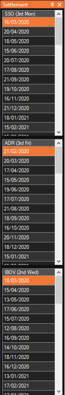 Mostrar código fonteRevisões anterioresLinks reversosVoltar ao topo Share via Share via... LinkedInAlterações recentesSend via e-MailPrintPermalink × Settlement Permite ver e selecionar as datas de vencimento dos contratos de acordo com cada modelo de papel. Ao selecionar uma data, é selecionado automaticamente uma opção listada que expira no mesmo dia, se houver. View Appreciator View Polynomial View Instruments View Risk Manager Última modificação: 2021/08/09 19:57por 54.36.148.64