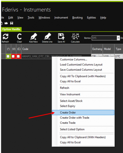 4. Na linha do Grid, clique com o botão direito no instrumento salvo, e depois em “Create Order”.