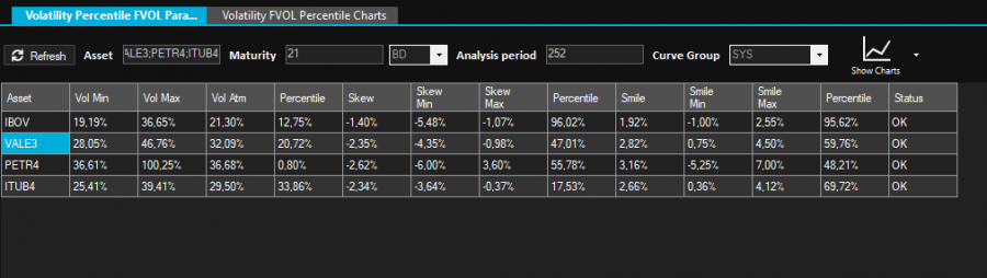 Após preencher os campos editáveis (Asset, Maturity, BD, Analysis Period e Curve Group) e clicar no botão Refresh os dados são listados no grid. A figura acima ilustra os resultados obtidos para o IBOV no período de 252 dias.