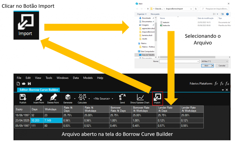 O arquivo estando estruturado de forma correta, isso significa que ele está pronto para ser carregado para na tela do Borrow Curve Builder. Para isso, clique com no botão Import da tela Borrow Curve Builder. Em seguida, selecione o arquivo (txt ou xlsx) na janela abrir e clique sobre o botão Abrir. Na sequência, o arquivo é carregado na tela e está apto para ser publicado como uma curva de borrow.